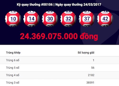 Theo thống kê trong năm 2017, đây là giải jackpot thứ 12 mà Vietlott mua được chủ sở hữu. Chỉ mới ngày 23/3, Vietlott vừa kết thúc trả thưởng cho chủ sở hữu độc nhất của giải jackpot trị giá hơn 43 tỉ đồng của kỳ quay 103.